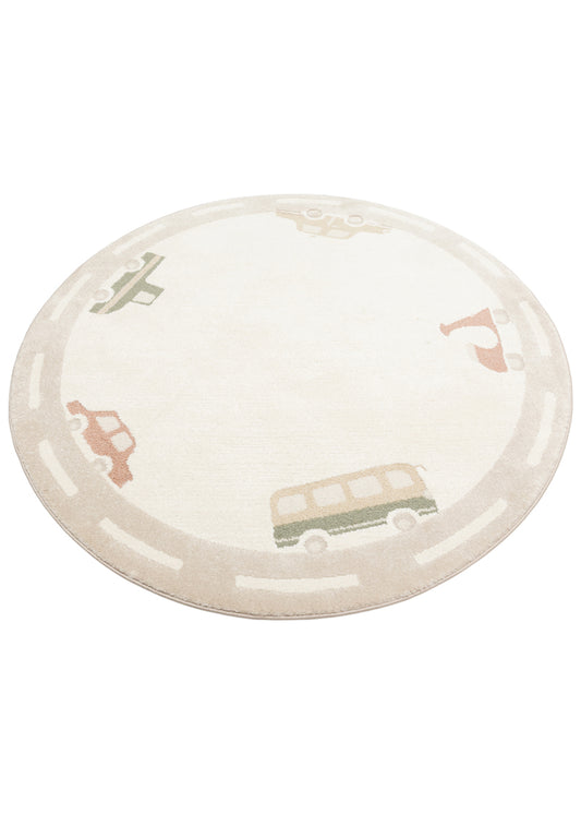 Petit Araba Desenli Yuvarlak Toz Vermeyen Yumuşak Dokulu Makinede Yıkanabilir Çocuk Odası Halısı - Bej