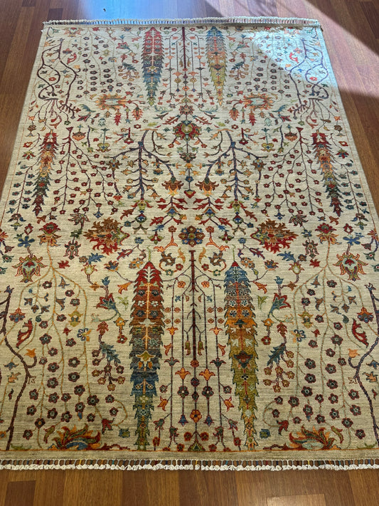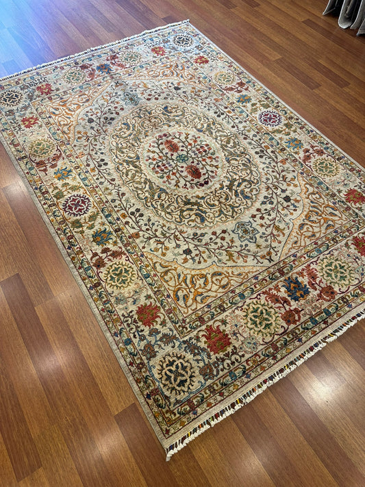 Hayat Ağacı Motifli İran El Dokuma Halısı – Orijinal Yün Klasik Krem Salon Halısı - Çok Renkli