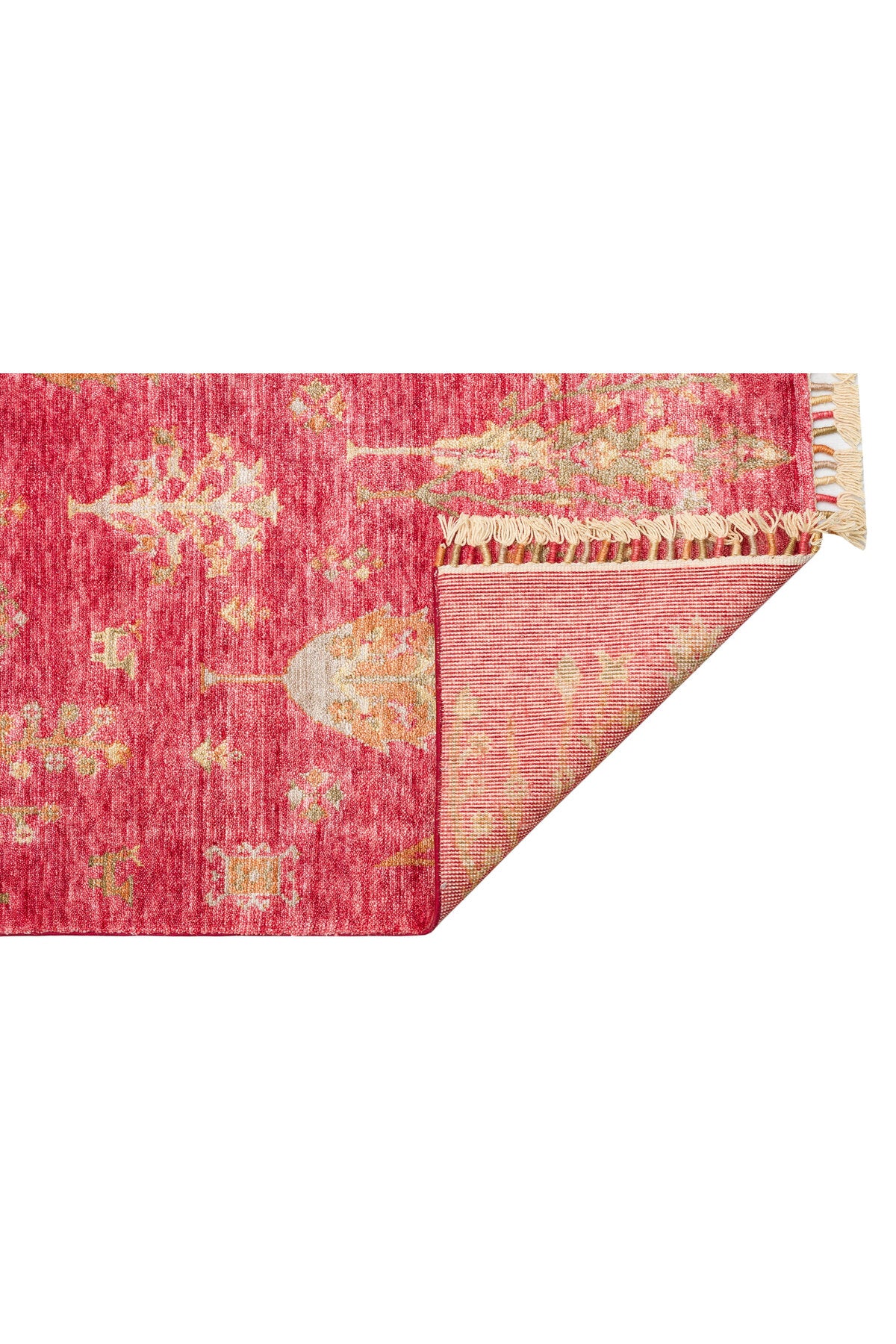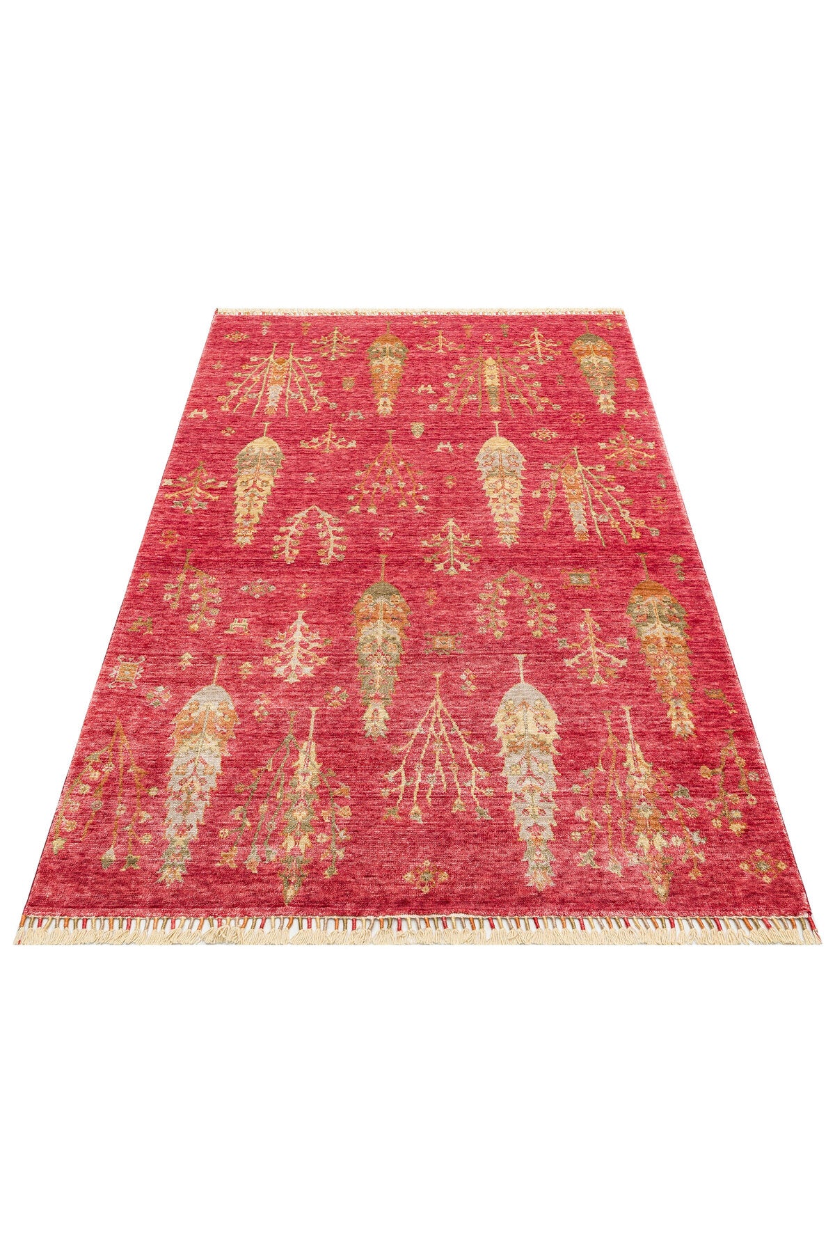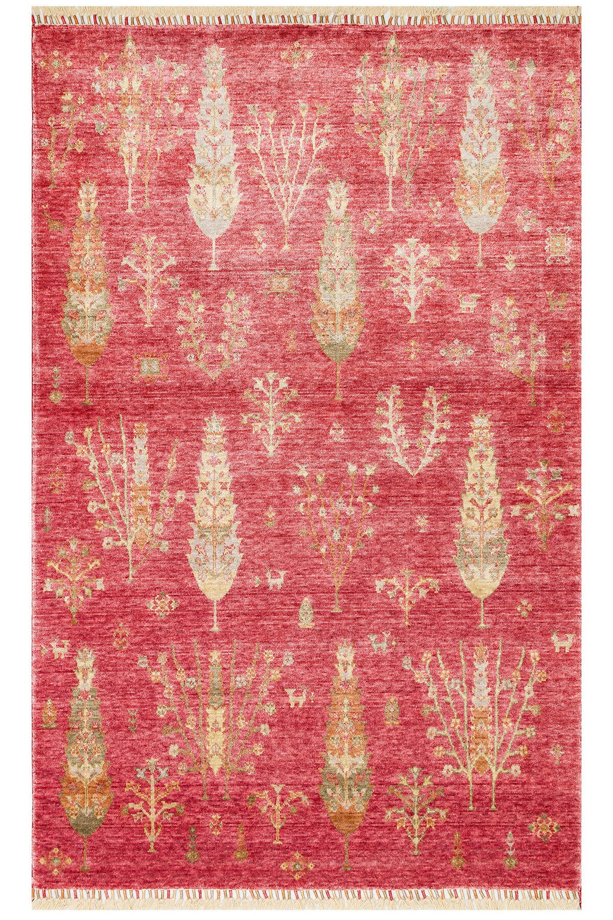 Efsun El Emeği Hayat Ağacı Desenli Kırmızı Lyocell Özel Tezgah Uşak Desen Saçaklı Salon Halısı