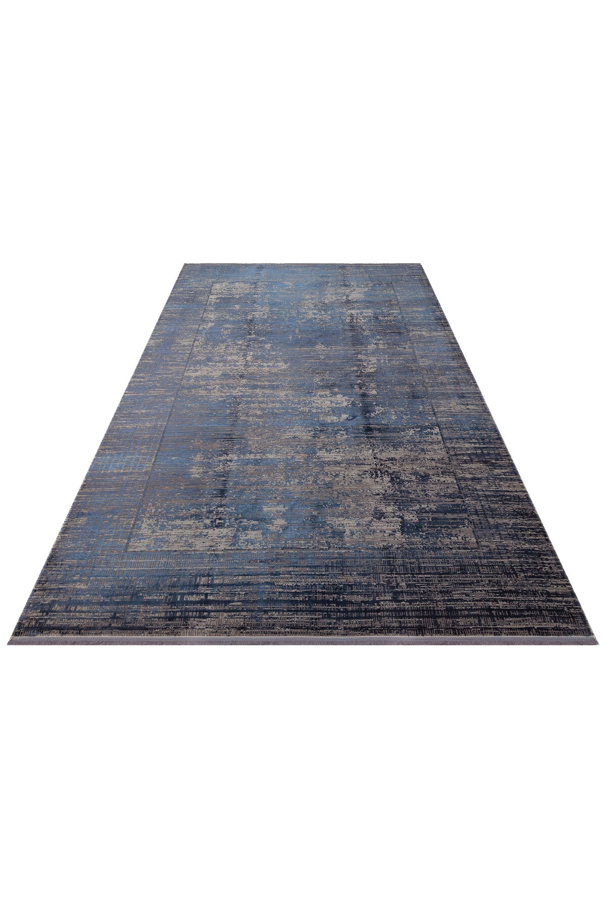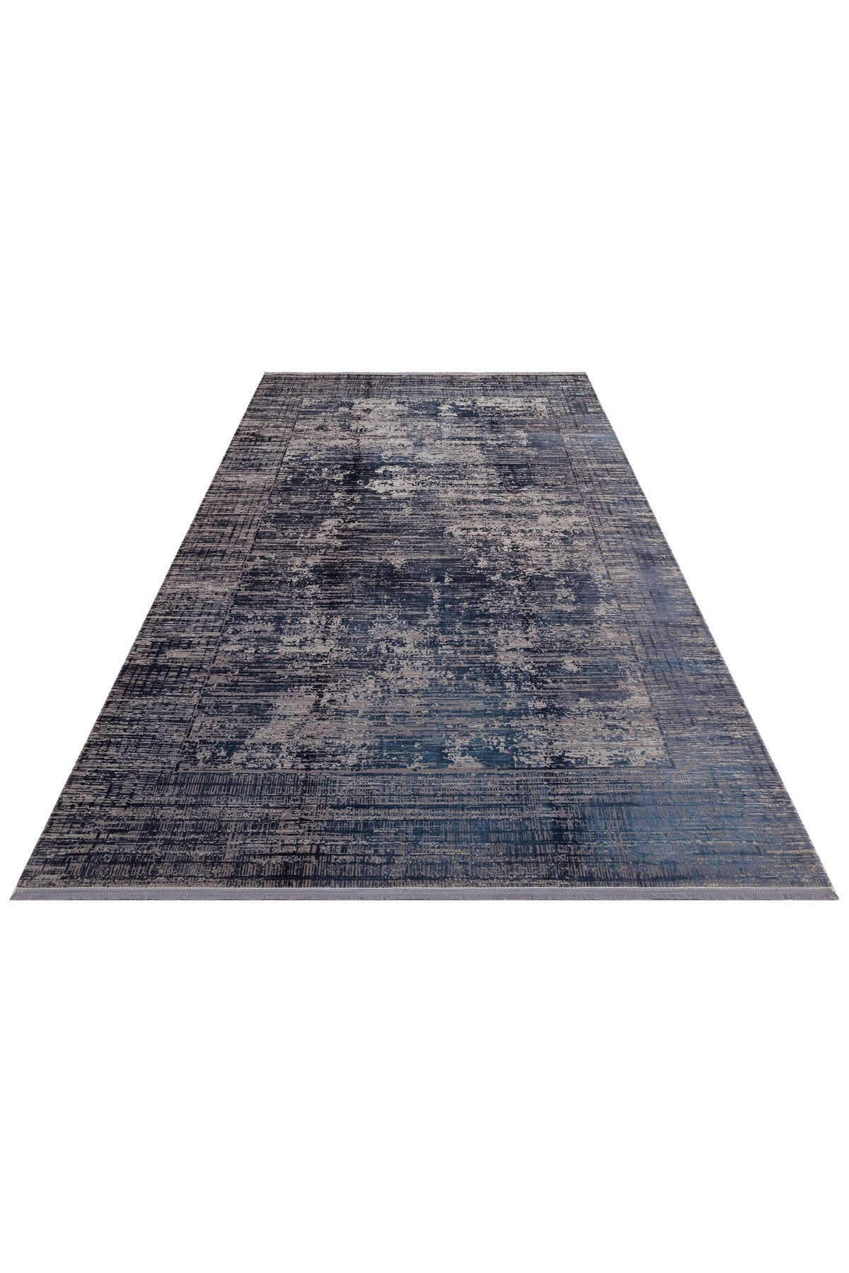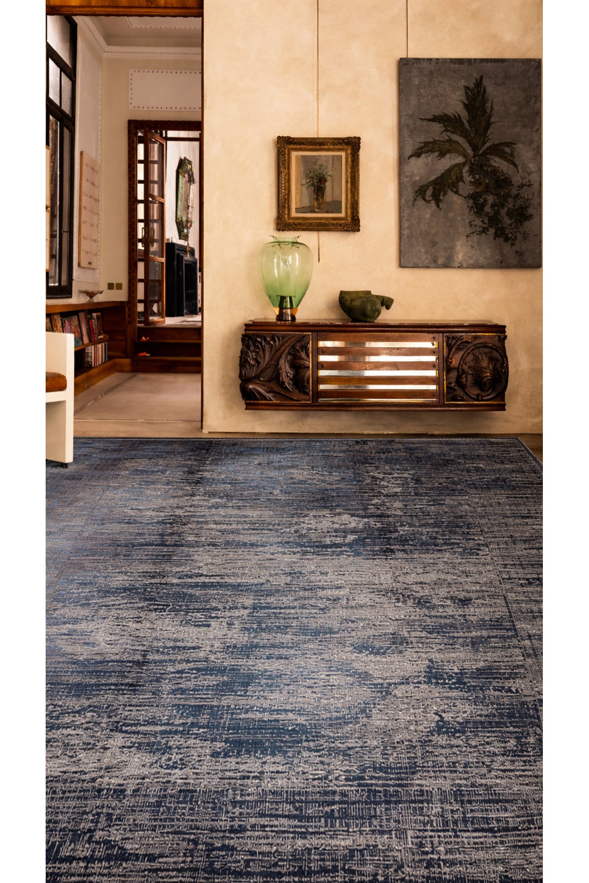 Lidya Dyed Vintage Çerçeveli Lacivert Gümüş Dokulu Parlak Sık Dokuma Klasik Salon Halısı