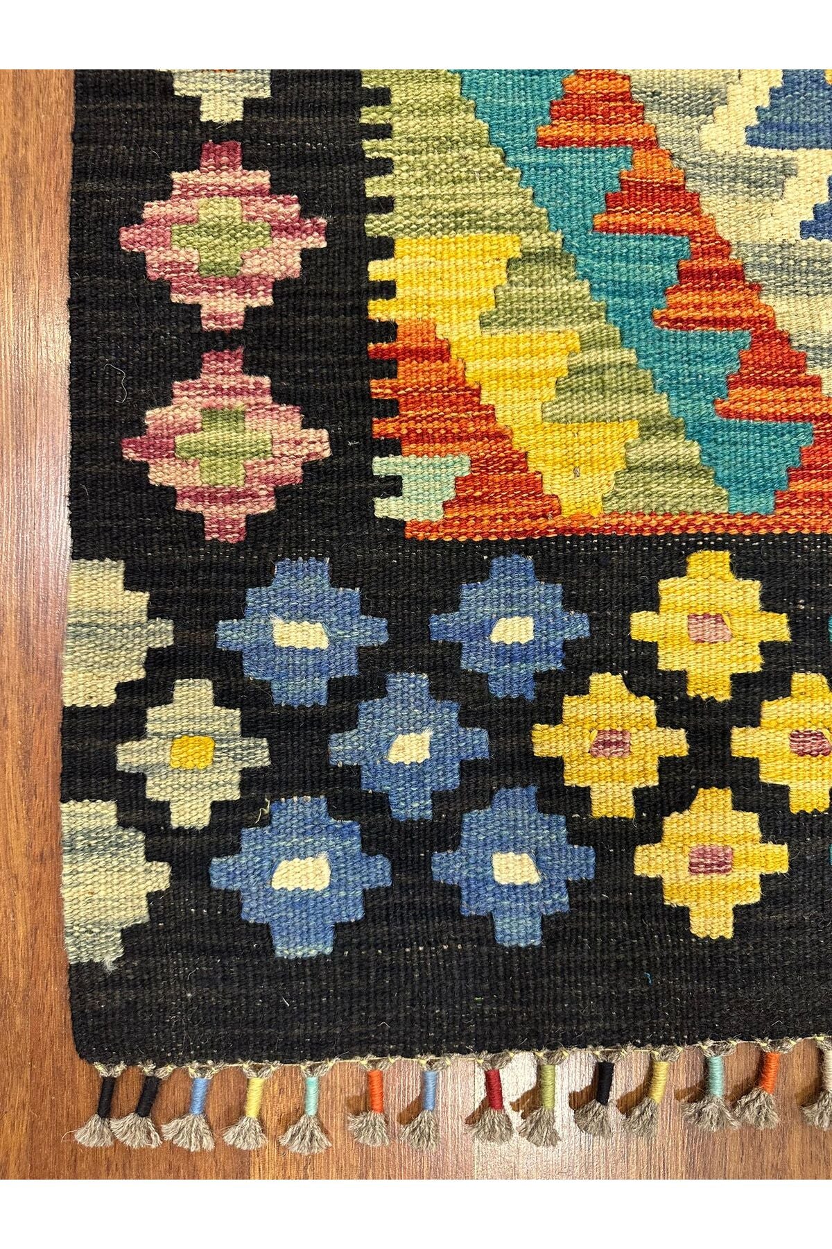 Miras Siyah Çerçeveli Etnik Desen Kök Boya El Emeği Doğal İplik Geleneksel Kilim Koleksiyonu - Kırmızı