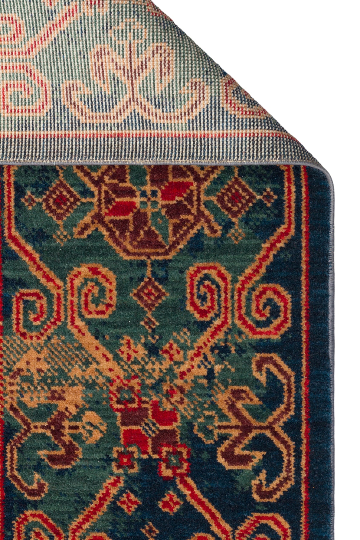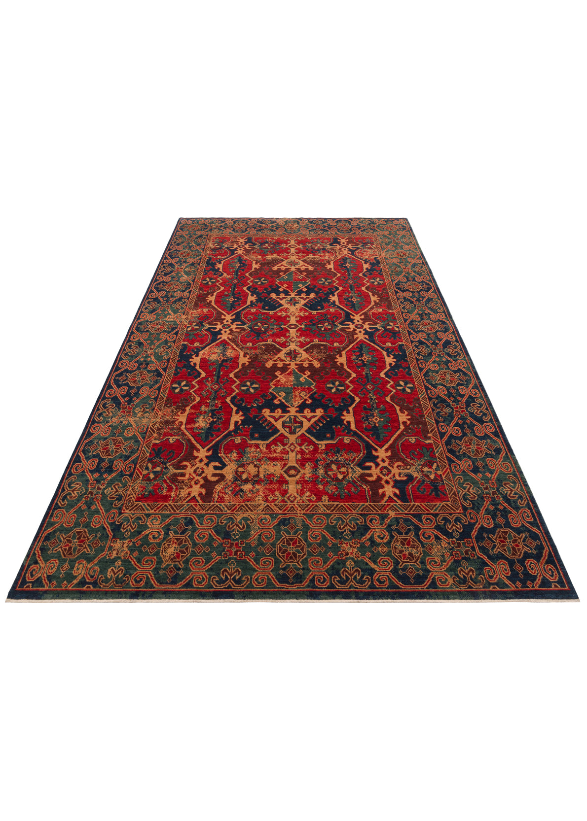 Rönesans El Emeği Etnik Desenli Lacivert Kırmızı Yün Saçaklı Anadolu Motifli Otantik Salon Halısı